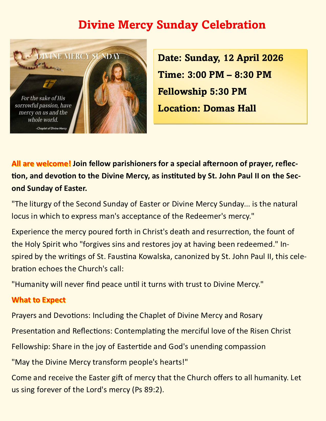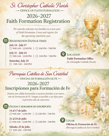 The 2024-2025 Faith Formation Year begins the week of October 8th, 2024.